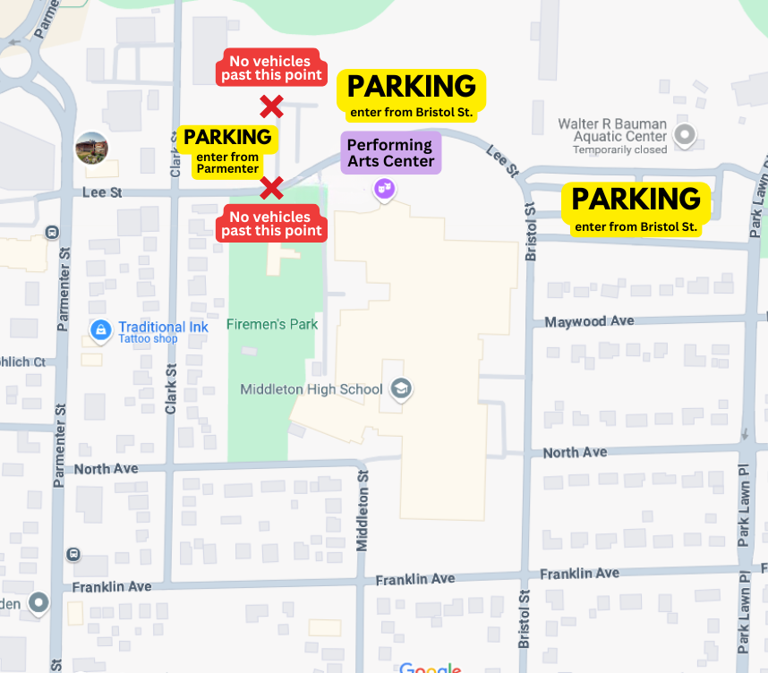 - All performances are at the Middleton Performing Arts Center, 2100 Bristol St., Middleton, WI 53562. (See below for parking map)